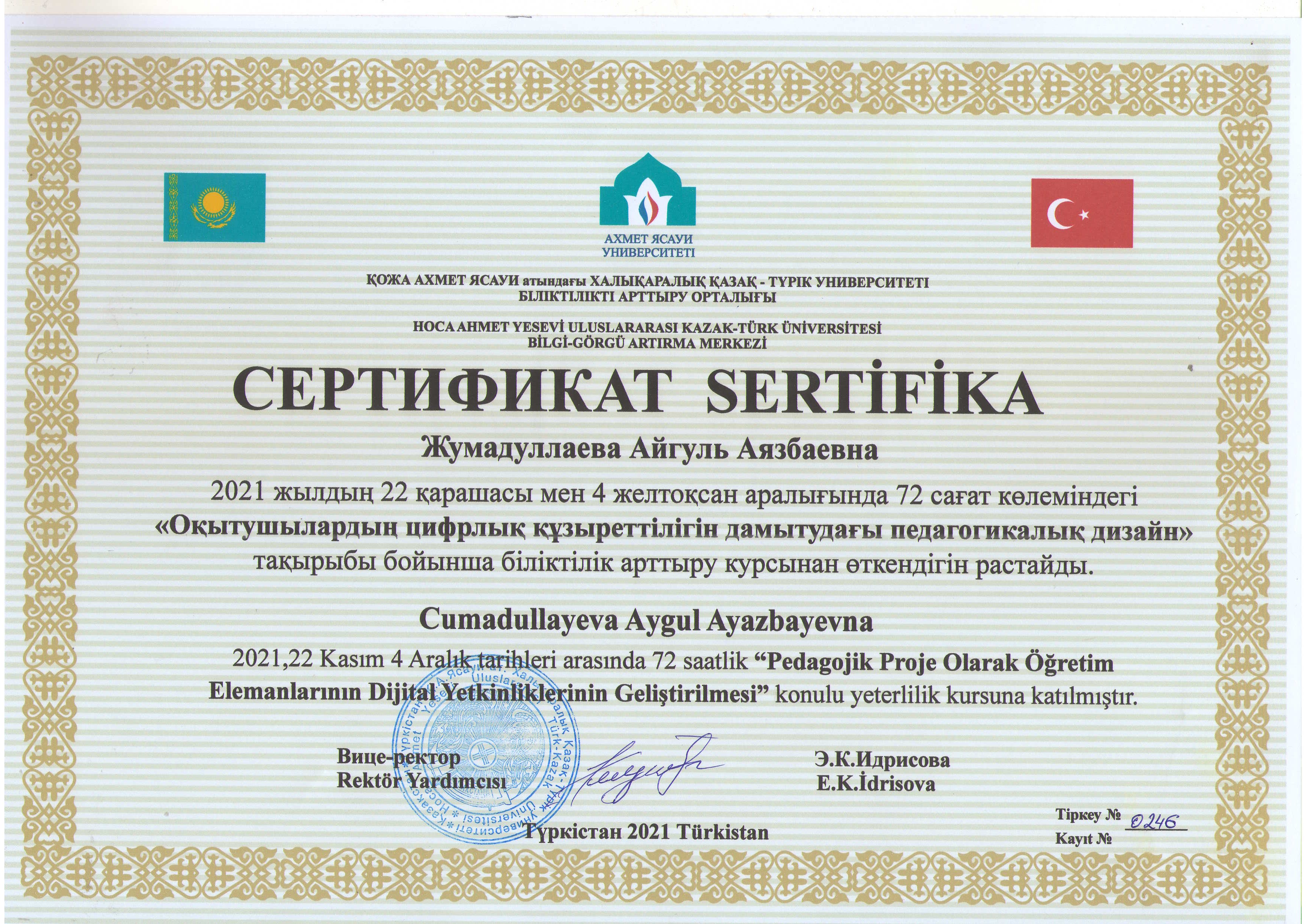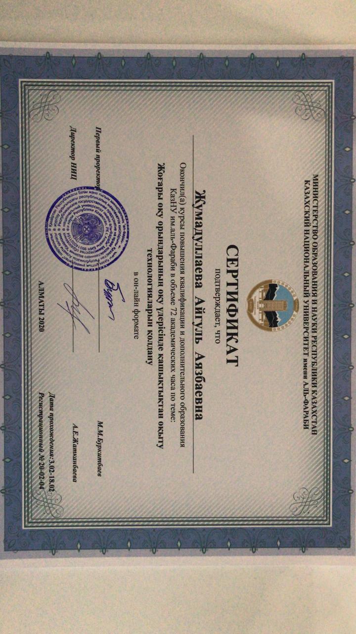 Педагогика ғылымдарының кандидаты, доцентЖумадуллаева Айгүл Аязбайқыз Өмірбаян Жумадуллаева Айгүл Аязбайқызы – 1971 жылы туылған, ұлты – қазақ, жоғары білімді маман, п.ғ.к., доцент. 1991 жылы Алматы қаласындағы Қыздар педагогикалық институтыныњ «Педагогика, психология (мектепке дейінгі)» мамандығына түсіп, 1995 жылы аталған мамандықты үздік дипломмен бітірдім. 2006 жылы 27 мамырда 13.00.01 - Жалпы педагогика, педагогика және білім тарихы, этнопедагогика мамандағы бойынша кандидаттық диссертация қорғадым.ҚР Білім және ғылым министрлігінің Білім және ғылым саласындағы қадағалау және аттестаттау комитетінің 2006 жылы 3 қарашадағы шешімімен (№12 хаттама) педагогика ғылымдарының кандидаты ғылыми дәрежесін алдым.ҚР Білім және ғылым министрлігінің Білім және ғылым саласындағы қадағалау және аттестаттау комитетінің 2009 жылы 23 желтоқсандағы шешімімен (№10 хаттама) педагогика мамандығы бойынша доцент ғылыми атағы берілді. Педагогика ғылымының саласында бүгінгі таңға дейін 130-ден аса ғылыми мақалалары мен оқу-әдістемелік құралдары жарық көрді. Оның ішінде 1 электронды оқулықтың, 8 оқу-әдістемелік құралдың, 2 оқулықтың авторымын. Сонымен қатар Томсон Рейтер дерек базасына еңген импакт факторы бар тіркелген журналдарда, алыс және жақын шетелдердегі халықаралық ғылыми-практикалық конференцияларда мақалаларым жарық көрген. Отбасылымын, екі қыз бен бір ұлдың анасымын.