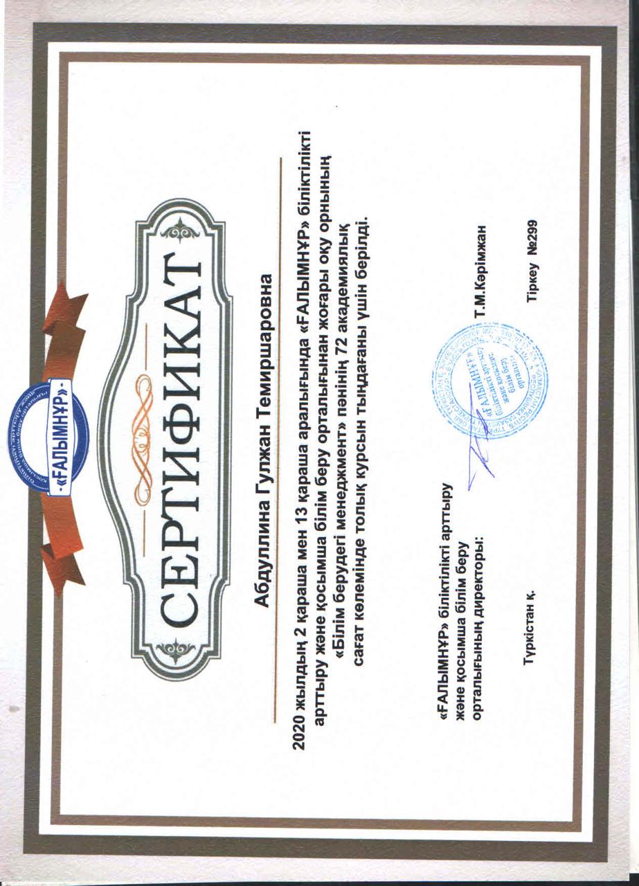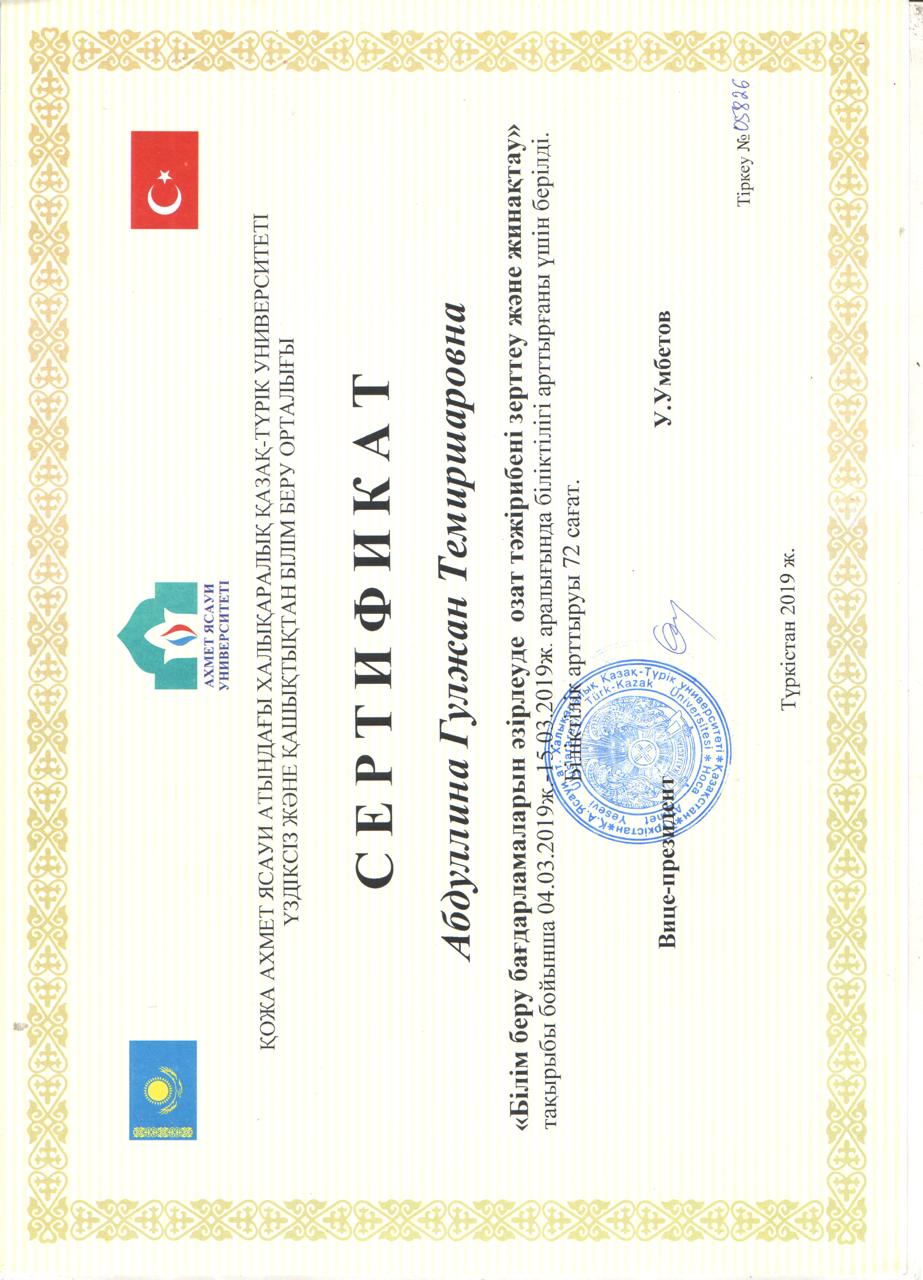 Абдуллина Гулжан Темиршаровна 1979 жылы сәуір айының 15 жұлдызында Ақтөбе облысы, Қандыағаш қаласында дүниеге келдім. Түркістан қаласындағы Қожа Ахмет Ясауи атындағы Халықаралық қазақ-түрік университетін 1998-2002 жылдары Шетел тілі: ағылшын тілі мамандығын бітіріп, Тіл үйрету орталығына оқытушы болып жұмысқа қабылдандым. 2002-2004 жылдары Педагогика және бастауыш оқыту әдістемесі бойынша 2-ші мамандық бітірдім. Қожа Ахмет Ясауи атындағы Халықаралық қазақ-түрік университетінде 2004-2006 оқу жылдары Педагогика және психология мамандығы бойынша магистрлік диссертациясын қорғадым.2013 жылы «Болашақ бастауыш сынып мұғалімдерінің технологиялық даярлығы мазмұнын жобалаудың педагогикалық негіздері» тақырыбында докторлық диссертация қорғап, 2014 жылдың 15 сәуірінде №650 бұйрық негізінде 6D010300- Педагогика және психология мамандығы бойынша философия докторы (PhD) ғылыми дәрежесін алдым. Қазіргі таңда «Мектепке дейінгі және бастауышта білім беру» кафедрасында оқытушылық қызметін атқарамын.