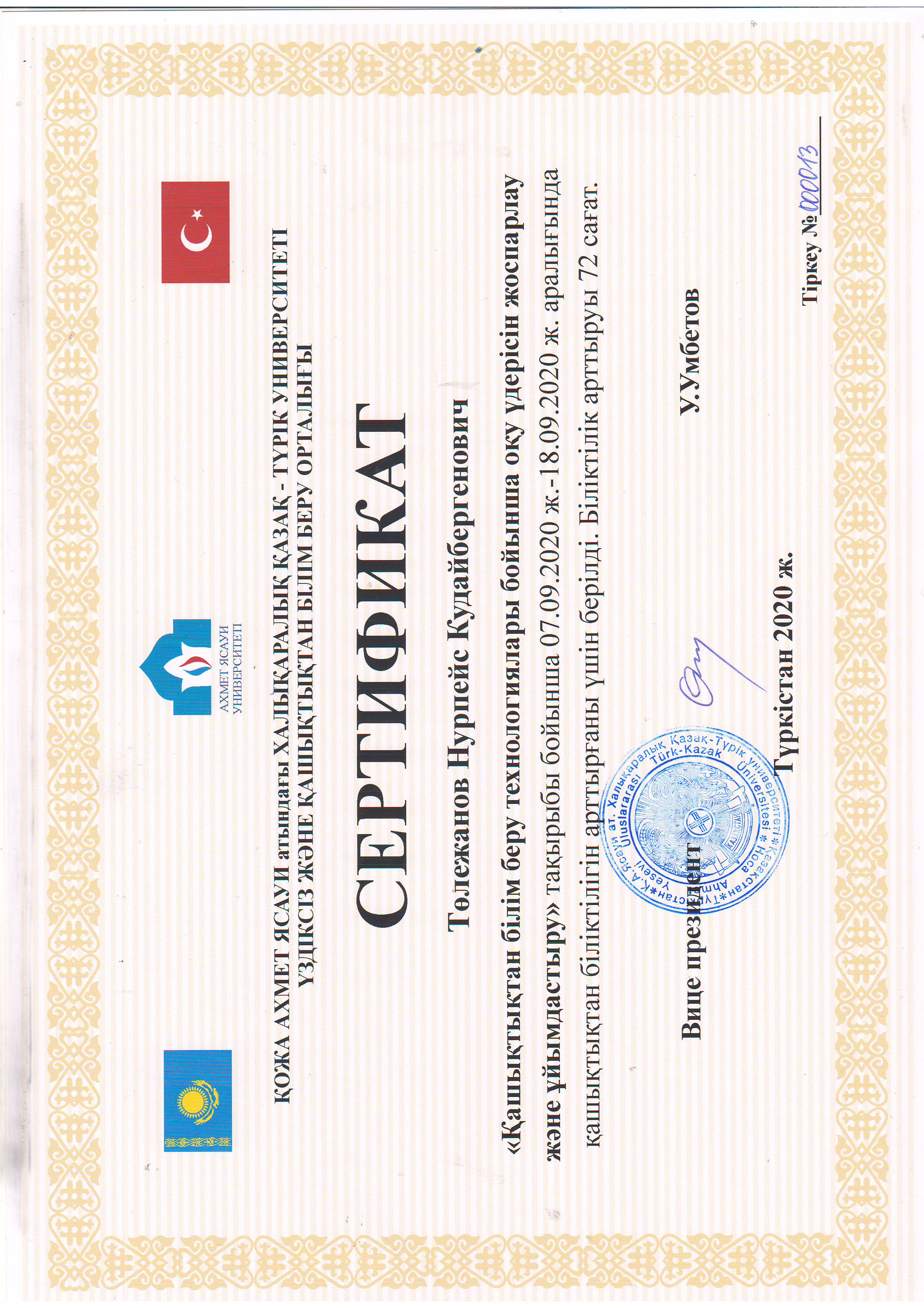 Төлежанов Нұрпейіс Құдайбергенұлы 10.07.1977 жылы Қызылорда облысы, Жаңақорған ауданында дүниеге келген. 1984-1994 жылдары жаңа оқу жылында Абай атындағы қазақ орта мектебін үздік бітірген. 1995-2001жылдары Ахмет Ясауи атындағы Халықаралық қазақ-түрік Университетіне Медицина факультетінің емдеу бөлімін бітіріп, «дәрігер» мамандығын алды. 2001-2002 жылдары Шымкент қаласында «Дәрігер хирург» мамандығы бойынша 1 жылдық интернатураны оқып шығады. 2002 жылдан бастап осы уақытқа дейін Қ.А.Ясауи атындағы ХҚТУ-дың Медицина факультетінде Хирургиялық аурулар кафедрасында аға оқытушы болып қызмет атқарды. 2002-2010 жылдары Кентау қалалық орталық клиникалық ауруханасының «Хирургия» бөлімшесінде дәрігер ординатор болып жұмыс атқарды.2008 жылы Астана қаласында 14.00.14 шифрлі мамандық бойынша «Сүт безінің Педжет обырының клиника биологиялық ерекшеліктеріне қарай емі және болжамы» атты тақырыбында кандидаттық диссертация қорғады. 2007 жылы Түркия Республикасының Анкара қаласындағы «Гүлхане Аскери Медициналық Академиясында» 1 айлық «Эндоскопия» мамандығы бойынша біліктілігін жетілдірді. 2010 жылдан Ахмет Ясауи атындағы Халықаралық қазақ-түрік Университетінің Клиника диагностикалық ортылығында дәрігер хирург болып қызмет жасап келеді. 2010-2011 жылы Түркия Республикасы Анкара қаласындағы «Хажетеппе Университетінің медицина факультетінің жалпы хирургия кафедрасында» 1 жылдық кәсіптік іліктілік жетілдіріп келді. 2012 жылы Түркия Республикасы Малатия қаласындағы Инони Университетінің Тургут Озал Медицина орталығында «Бауыр трансплантациясы және резекциясы» тақырыбында біліктілігін арттырды. 2016 жылы Түркия Республикасы Измир қаласындағы Еге Университетінде «Қал,анша без және қалқанша маңы безінің өзекті мәселелері» тақырыбында біліктілігін арттырды. 45 ғылыми мақаласы, 2 патенті жарық көрді және 4 оқу құралы басылып шықты. Отбасылы: 3ұл және 3қызы бар.Ұялы телефоны: 87754688607, 87779182545.G-mail: nurpeis.tulejanov@ayu.edu.kz