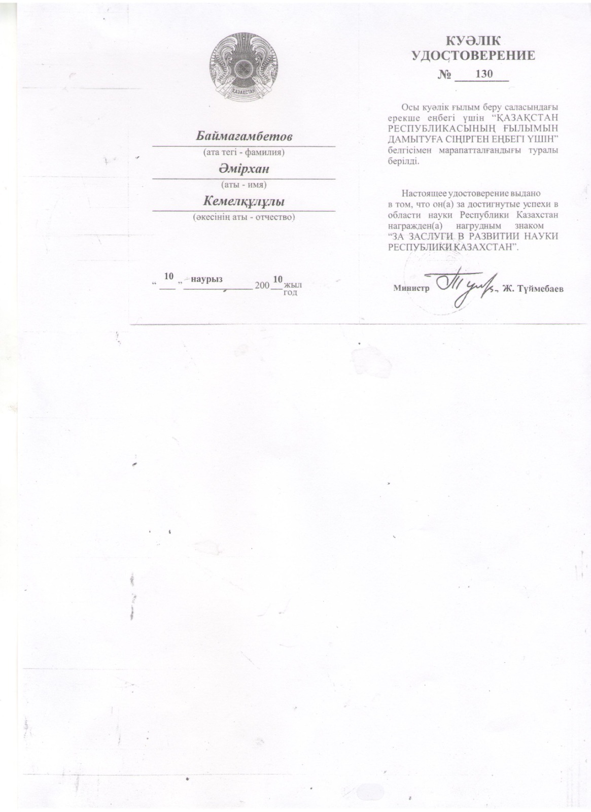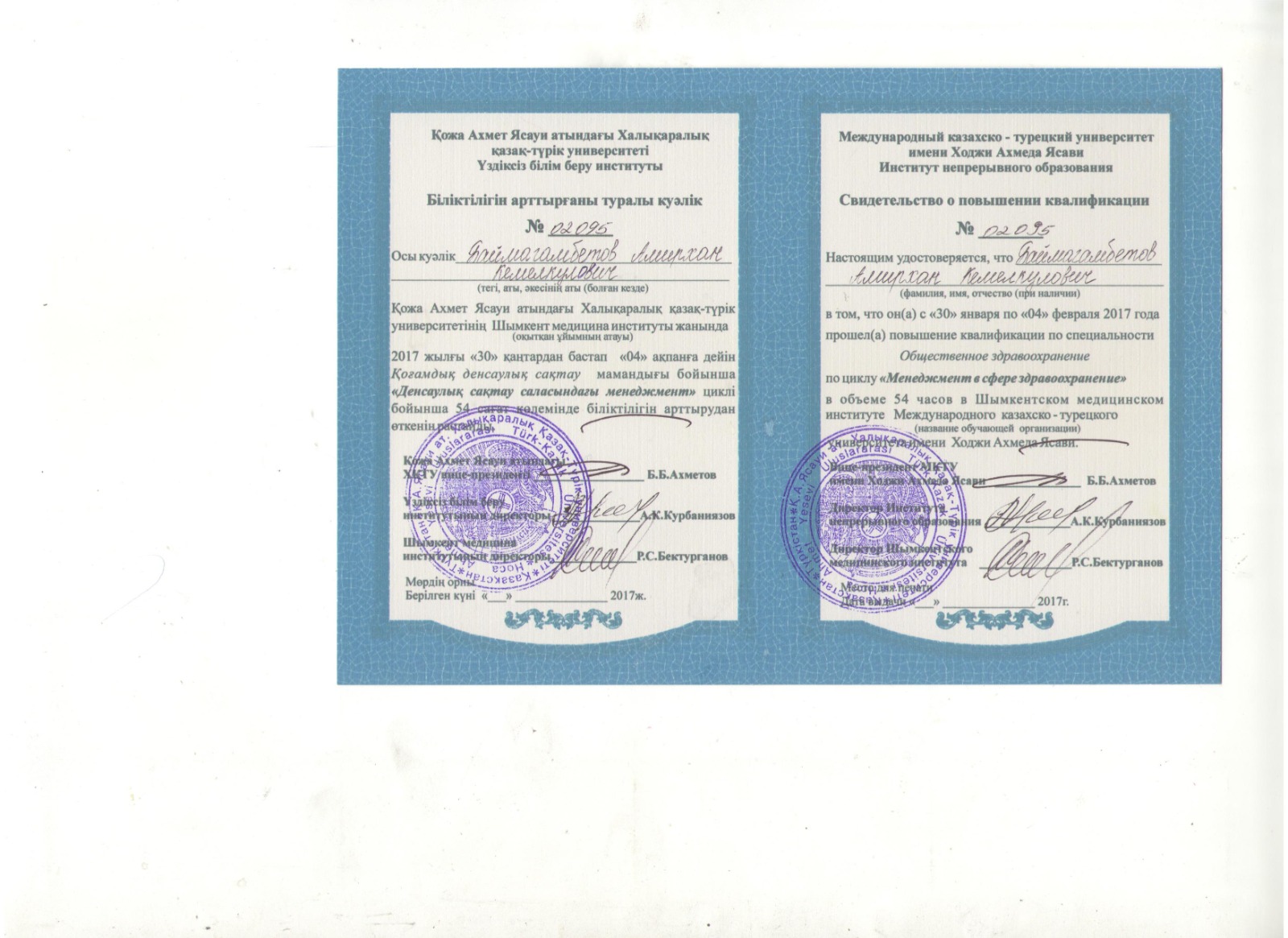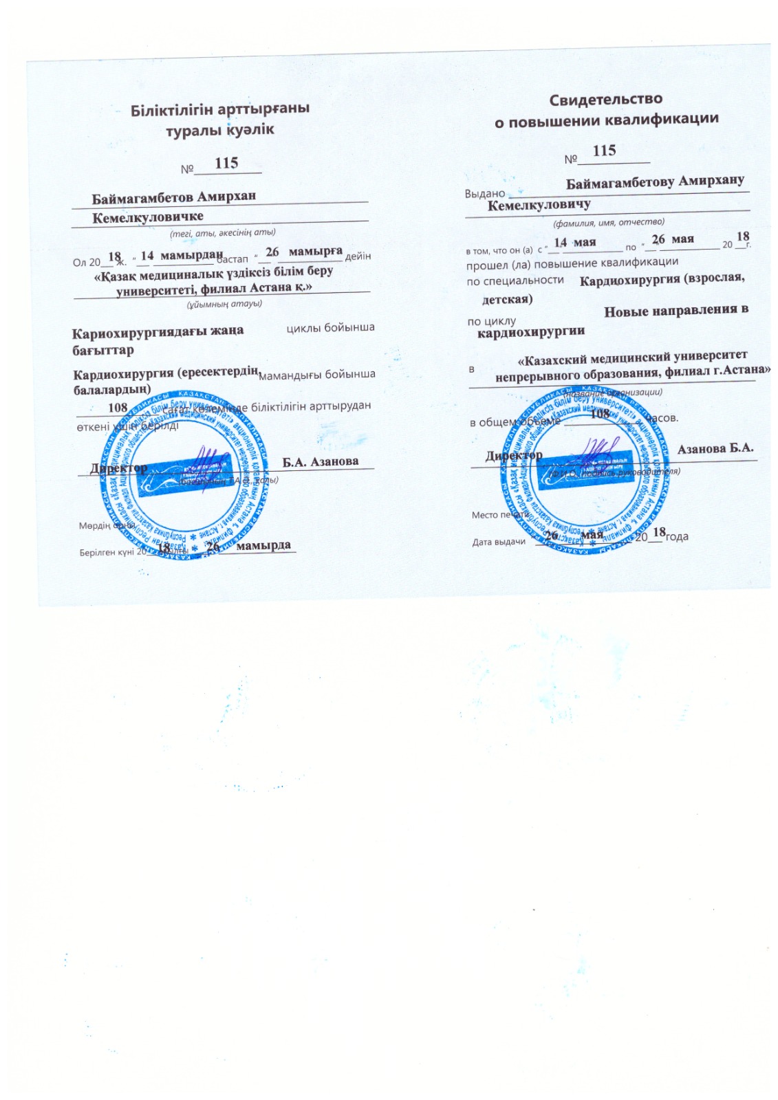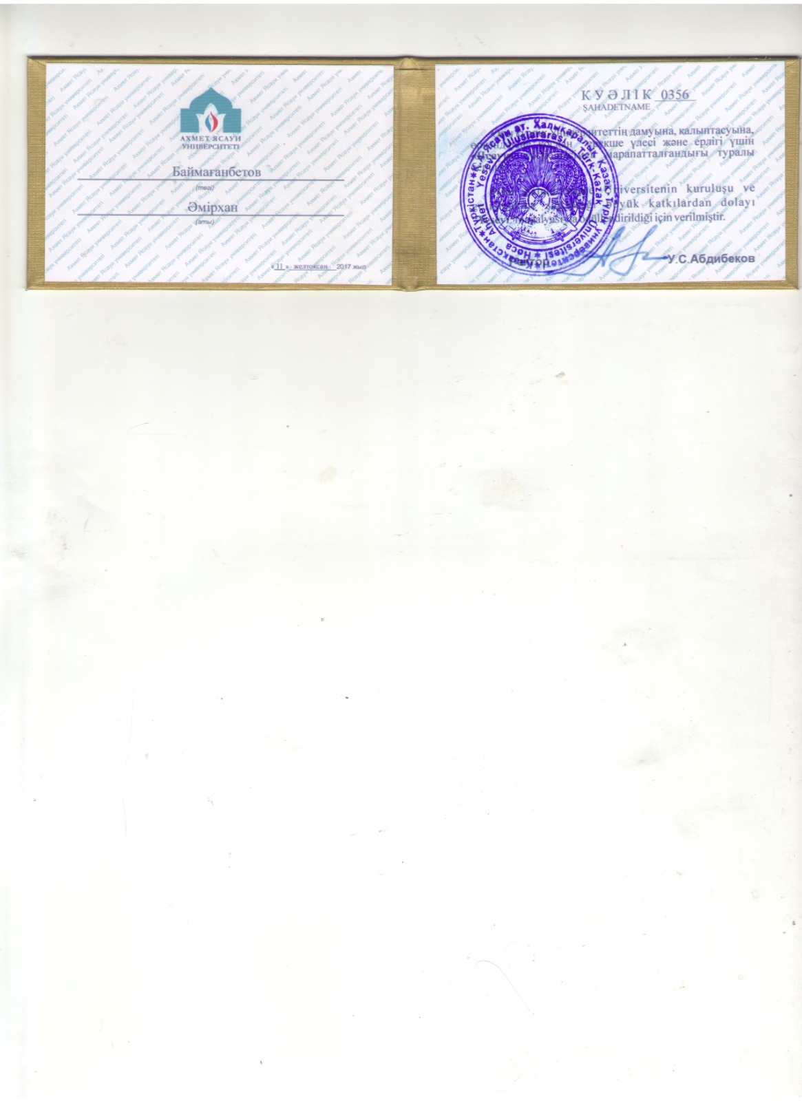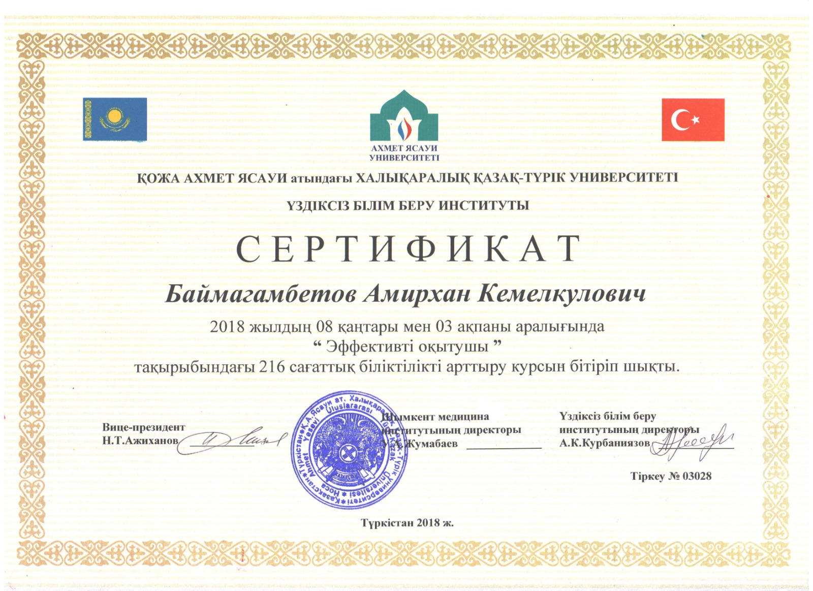Өмірбаян Баймағамбетов Әмирхан Кемелкұлұлы 1958 жылы 1 маусымда Оңтүстік Қазақстан облысының Түлкібас ауданы Киров колхозының Қайршақты бөлімшесінде оқү ағарту қызметкерлерінің жанұясында дүниеге келді. Ұлты қазақ.Абай атындағы орта мектепті 1975 жылы үздік бітіріп, сол жылы Алматы мемлекеттік медицина институтының «Емдеу ісі» факультетіне оқуға түсті. 1981 жылы дәрігер мамандығымен институтты үздік бітіріп, Шымкент қаласынында облыстық ауруханада интернатураны өтті. 1982 жылы Шымкент қалалық жедел жәрдем ауруханасында «хирургия» бөліміне хирург- дәрігер болып орналысты.1985-1987 жылдары Мәскеу қаласындағы Бүкілодақтық «Хирургия Ғылыми Орталығында» хирургиядан клиникалық ординатура өтті.1986-1990 жылдары Мәскеу қаласындағы Бүкілодақтық «Хирургия Ғылыми Орталығында» ізденуші болып, 1990 жылы «Жүрек- қан тамырлары хирургиясы» (14.00.44) мамандығы бойынша «Оценка фактора риска и прогнозирование в хирургии аневризмы брюшной аорты» тақырыпта кандидаттық диссертация қорғап шықты.1987-1992 жылдары Шымкент қаласы жедел жәрдем ауруханасында хирург, қан-тамыр хирургі мамандығы бойынша қызмет етті.1992-1998 жылдары Мәскеу қаласындағы Ресей «Хирургия Ғылыми Орталығында» доктарантурада оқып, 1998 жылы «Хирургические и рентген- хирургические методы лечения окклюзионно- стенотических заболеваний артерии» тақырыпта докторлық диссертация қорғап шықты.1998-1999 жылдары ОҚММА профессор міндетін атқарушы қызметін атқарды. 1999 жылдың 22 қыркүйегінен – тамыз айы 2020 жылдың аралығында үздіксіз 21 жыл Қ.А. Ясауи атындағы ХҚТУ-нің медицина факультетінің хирургия кафедрасын басқарды. Жұмыс орнында:2009, 2015 жылдары ХҚТУ Президент атынан мақтау қағаздарын алған,2010 жылы ҚР БжҒм Білім және Ғылым беру саласындағы ерекше еңбегі үшін «Қазақстан Республикасының ғылымын дамытуға сіңірген еңбегі үшін» МОиНРК «Ғылымға сіңген енбегі үшін» белігісімен марапаталды. 2011 жылы БжҒМ ҚР «Ғылымға сіңген енбегі үшін» медалімен, 2015 жылы ҚР ДСМ алғыс хатымен марапаталды. 2015 жылы азаматтардың денсаулығын сақтау, әлеуметтік қамсыздандыру ісіне қосқан жеке үлесі, мінсіз адал еңбегі үшін ҚР денсаулық сақтау және әлеуметтік даму министірілігінен алғыс хатпен марапаталды.2017 жылы Университеттің дамуына, қалыптасуына, өркендеуіне қосқан ерекше үлесі және ерлігі үшін «Ясауи» белгісімен марапатталды. Жанұясы бар, жұбайымен 5 баланы тәрбиелеп отыр. Жетістіктер: 140 астам мақалалар, 10 астам оқу құралдар мен патенттер, осы жылдарға дейін 10 астам Халықаралық және Республикалық ғылыми конференциялар, симпозиумдар өткізді. Марапаттау қағазы Тегі, аты, әкесінің аты: Баймағамбетов Әмирхан КемелкұлұлыЛауазымы, жұмыс, қызмет орны: Қ.А.Ясауи атындағы Халықаралық қазақ-түрік университетінің, Шымкент медицина институтының «Травматология-ортопедия және онкология» кафедрасының м.ғ.д., проф.м.а.Жынысы: ЕрТуған жылы және туған жері: 1 маусым, 1958 жылы, Оңтүстік Қазақстан облысының Түлкібас ауданыҰлты: ҚазақБілімі: Жоғары, Алматы мемлекеттік медицина институтының «Емдеу ісі» мамандығыМекен жайы: Шымкент қаласы, уч. Самал , 178Жалпы еңбек өтілі: 40Осы ұжымдағы еңбек өтілі: 40Марапатталушының сипаттайтын мінездеме: 1958 жылы 1 маусымда Оңтүстік Қазақстан облысының Түлкібас ауданы Киров колхозының Қайршақты бөлімшесінде оқү ағарту қызметкерлерінің жанұясында дүниеге келді. Ұлты қазақ. Білімі: 1975 – 1981 ж.ж. - Алм