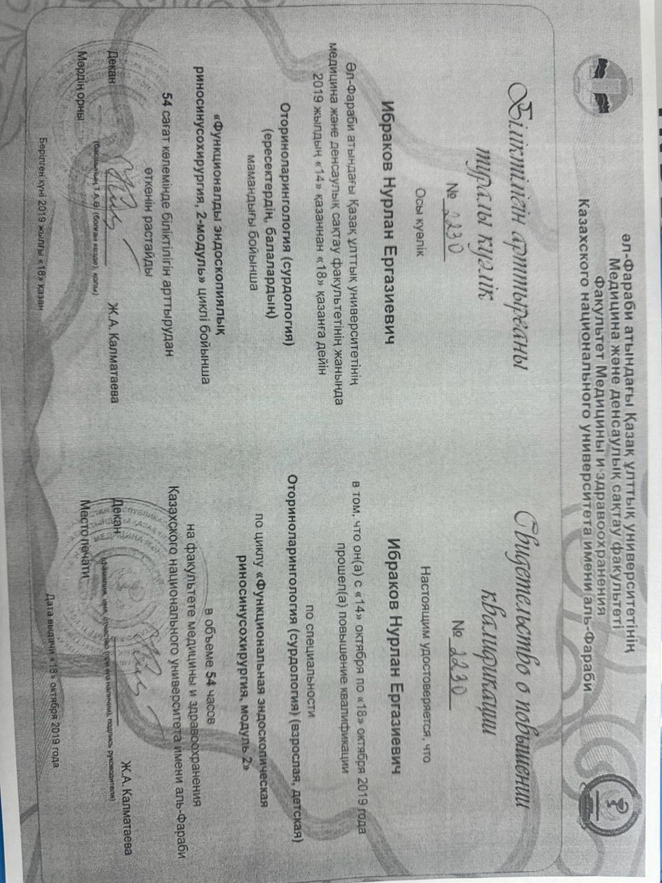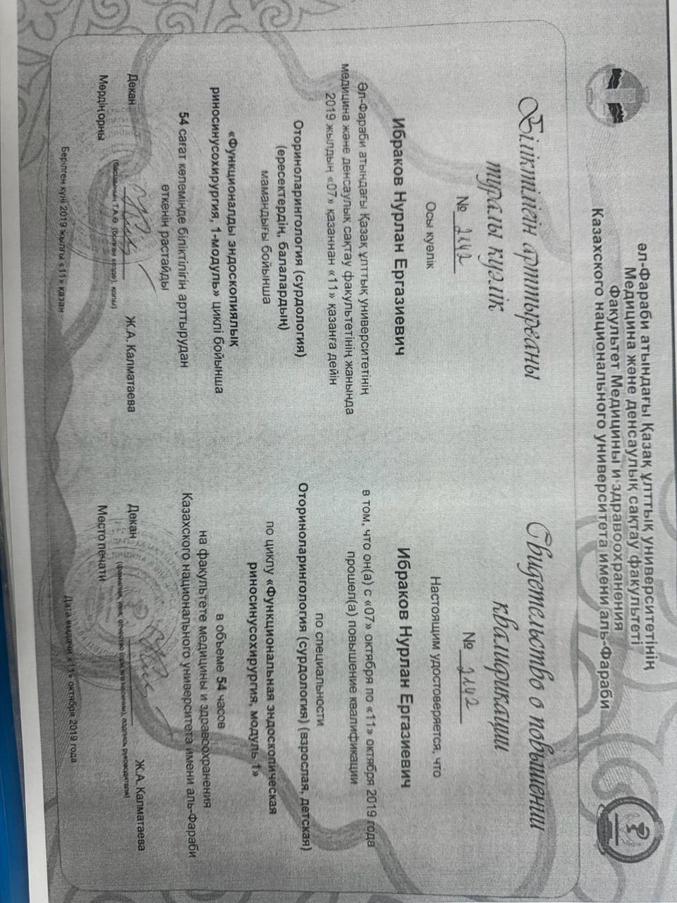 Ф.И.О.: Ибраков Нурлан Ергазиевич Образование: Высшее медицинское 1985-1993 Актюбинский государственный медицинский институт.1993-1994:Интернатура2013 :Категория – высшая .Опыт работы:Академический:Работа в данной организации2022-по настоящее время : Преподаватель МКТУ им К.А.Ясауи. 2021- по настоящее время:Оториноларингология Неакадемический:1994 – по настоящее время:Врач оториноларинголог. Повышение квалификации:2019г: 2019г:Центр непрерывного профессионального развития : «Алгоритмы оказания неотложной помощи и медицинской сортировки пациентов» - 54ч .Казахский национальной университет им. аль – Фараби «Функциональная эндоскопия риносинусохирургия»